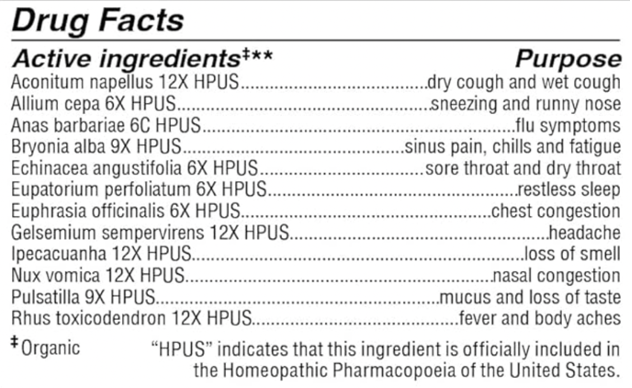 Oscillococcinum® is a patented homeopathic medicine that contains a highly diluted extract of wild duck heart and liver. Since these organs may be reservoirs of flu viruses, this product may be vaccine-like. However, in a review of clinical studies to date, the authors concluded that there is not compelling evidence that this product prevents the flu or helps to treat symptoms.