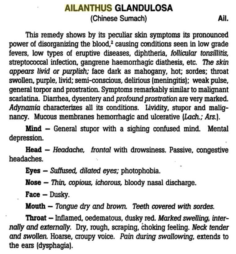 For example, this excerpt from Boerike’s Materia Medica is said to describe the results of consuming Ailanthus glandulosa, which reportedly caused the throat to be “swollen, purple, and livid.”