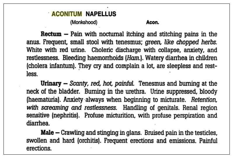 Here’s another example. Highly diluted Aconitum napellus is used for urinary tract pain because William Boericke wrote in his Materia Medica that Aconitum napellus caused burning in the bladder and urethra, in addition to many other adverse effects, a few of which are shown in this excerpt.
